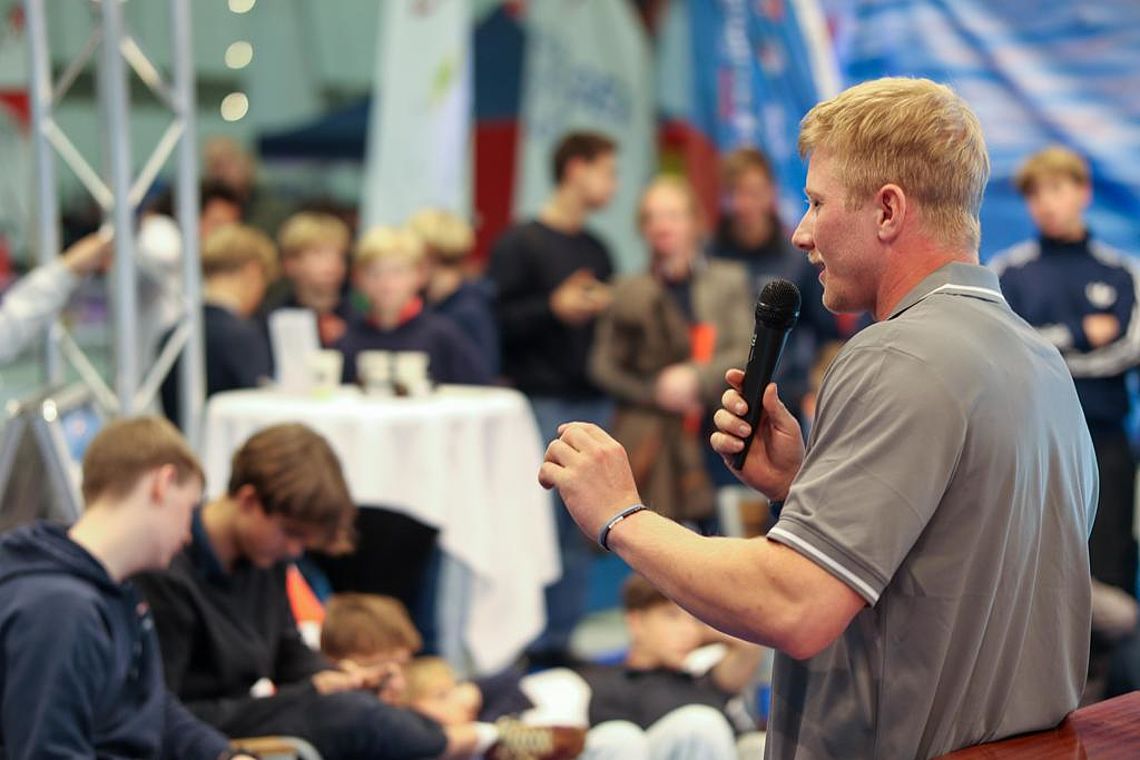 Danach berichtete Fabian Rieger von seinem Weg nach LA 2028. Der Traum von der Teilnahme an den Olympischen Spielen im 49er lebt bei ihm mit voller Begeisterung. Er zeigte Eindrücke in seinen Alltag als Spitzensegler: Athletiktraining im Kraftraum, Training auf dem Wasser, Regatten, Reisen, Bootsbau und dankte ganz vielen tollen Leuten, die ihn auf seinem Weg begleiten. Sein Elan schwappte sichtlich auf die Zuhörer über, die im Anschluss noch viele Fragen an ihn hatten.