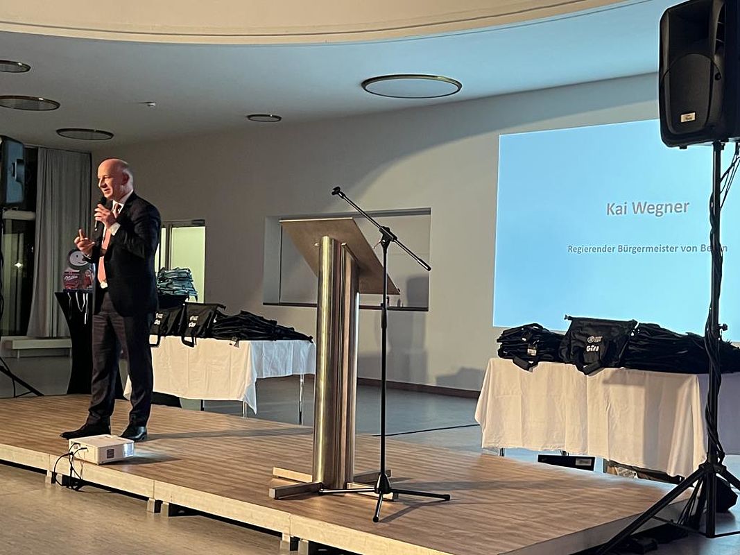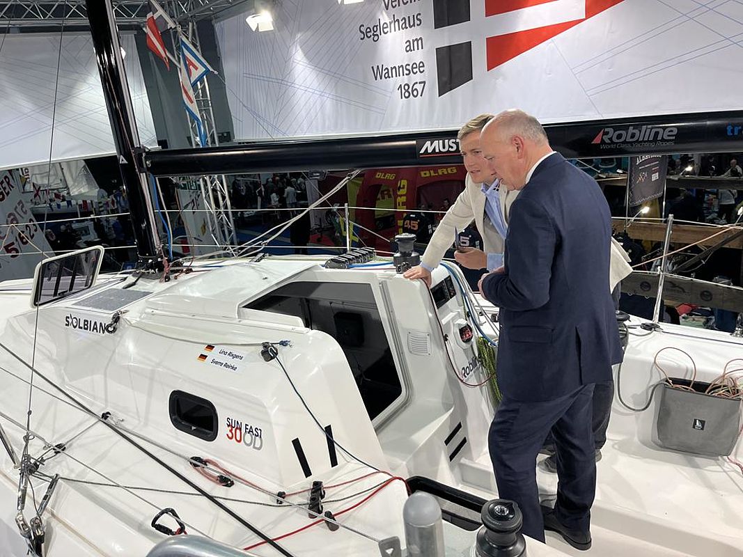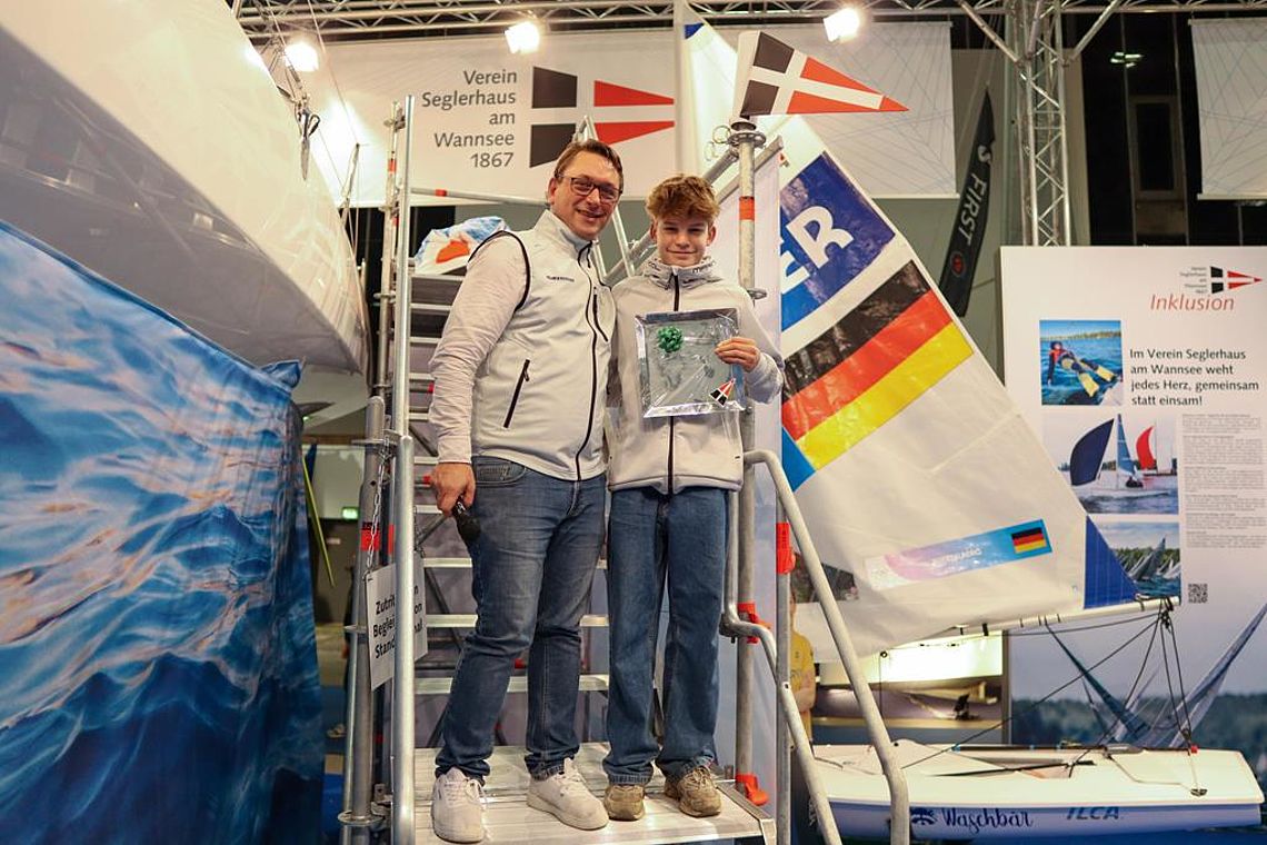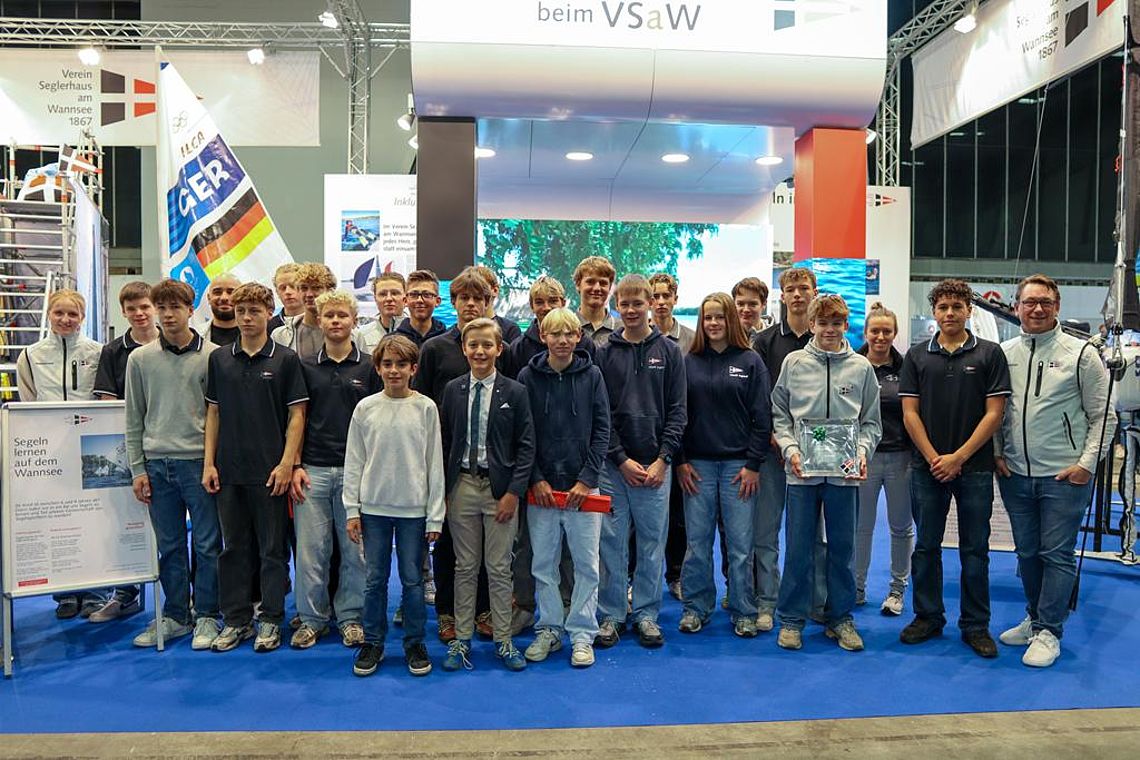 Der Stand wurde am Mittwochabend bei der ‘Galanacht der Boote‘ mit einer kurzen Ansprache von unserer stellvertretenden Vorsitzenden Marlene Raabe-Steinherr eröffnet. Neben vielen Mitgliedern und Freunden des Verein besuchte auch der Regierende Bürgermeister von Berlin Kai Wegner den Stand. Zuvor waren viele Seglerinnen und Segler des VSaW bei der Meisterehrung des BSV von Kai Wegner, dem BSV-Jugendobmann Paul Naber, dem Obmann für Leistungssport Hartmut Papenthin sowie dem Obmann für Wettsegeln Clemens Fackeldey geehrt worden; insbesondere die WANNSEEATEN wurden öfters auf die Bühne gebeten: erstklassige Leistungen bei den Deutschen Jugendmeisterschaften, dem Opti-Team-Race und Teilnahmen an EM und WM wurden ebenso gewürdigt wie die errungenen Titel von unseren Leistungsseglern wie Julia Büsselberg (ILCA 6) und Anna Markfort (470er mixed gemeinsam mit Simon Diesch (WYC)), die leider die Würdigung nicht selbst entgegennehmen konnten, da sie – wie man es erwartet – im Moment voll im Training stecken und gar nicht im Land sind.