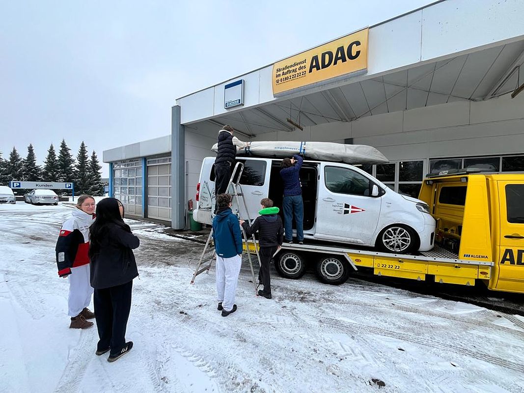 Mit Schlittern und Rutschen wurden die Boote mühsam auf die Hänger verladen. Die Glätte auf dem Gelände machte das nicht einfach und warf kurzzeitig die Frage auf, ob die Busse die Anhänger überhaupt über die vereisten Wege ziehen könnten. Doch die Sorgen erwiesen sich als unbegründet, und die Glätte hinderte nicht am Aufbruch.