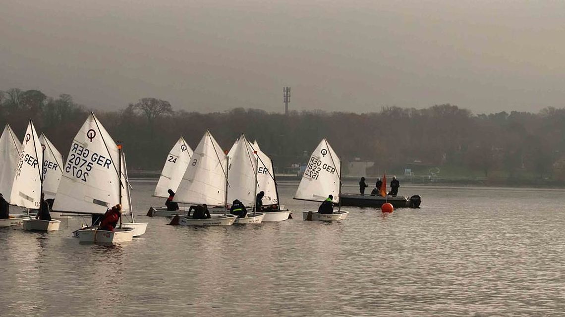 Auch diesmal war es so. Für den 31. Opti-Eis-Cup am 9. November 2025 hatten sich ähnlich viele Teilnehmer angemeldet wie im Vorjahr. Neben vielen Eltern beteiligten sich auch zahlreiche Trainer und aktive Segler. Das versprach spannend zu werden. Allerdings spielte das Wetter nicht mit. Es gab kaum Wind und somit keine spannenden Kämpfe. Stattdessen empfing uns der Tag mit viel Nebel, Kälte und wenig Wind. Am Ende herrschte Flaute, obwohl viele Zuschauer vom Ufer aus die Segler anfeuerten.