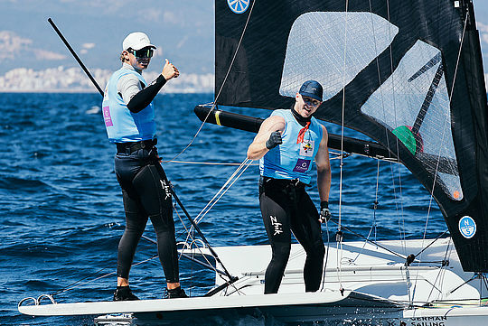 Bei den 470er mixed meldeten sich Simon Diesch (WYC) und Anna Markfort (auch JSC) nach einer studienbedingten Pause von einigen Monaten zurück und knüpften nahtlos an die Erfolge der Vorsaison an; sie belegten im Feld der 64 Boote Rang 6. Malte Winkel (NRV/SYC) und Paula Amelie Schütze (auch NRV) erreichten Platz 23, während Theres Dahnke (PWV) und Paco Melzer (auch YBG) kurz dahinter auf Platz 26 kamen.