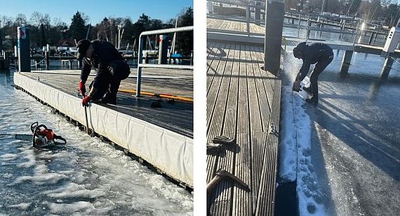 Wir möchten jedoch darauf hinweisen, dass das drückende Eis auch immer eine Gefahr für die Steganlage bedeutet. Daher werden kritische Stegbereiche - insbesondere bei der Schwimmplattform und der Jollenrutsche an der Jollenwiese und der Jollenzugang - durch unsere Werftmitarbeiter Lars Haverland und Kai Rädisch vom Eis freigeschnitten, um Beschädigungen entgegenzuwirken.